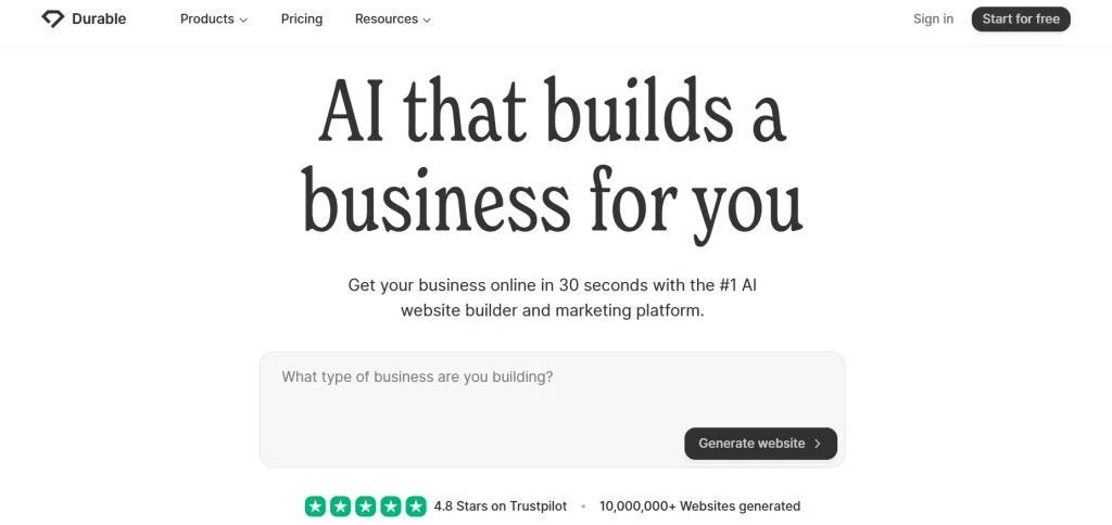 Why it stands out: Durable focuses on speed. You describe your business, and the AI generates a landing page with text, layout, and even stock images in under a minute.