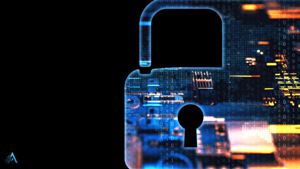 3D illustration of glowing padlocks on computer chips, symbolizing data protection concerns with free AI tools and digital privacy