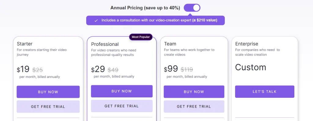 | Free Trial | New users | Try core tools, limited exports, explore AI voiceovers and captions. |